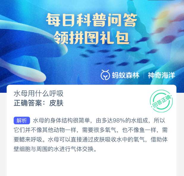 软件提交 专题合集 热门手游支付宝蚂蚁森林神奇海洋2025年7月18日问题已经更新,今日题目是:水母用什么呼吸?正确答案是:【皮肤】。水母可以直接通过皮肤吸收水中的氧气,借助体壁细胞与周围的水进行气体交换。