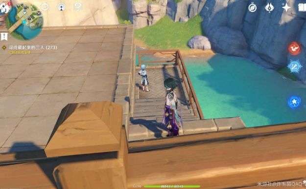 大隆在箱子后面,小乐在传送点的树旁边,重云在桥的楼梯那。