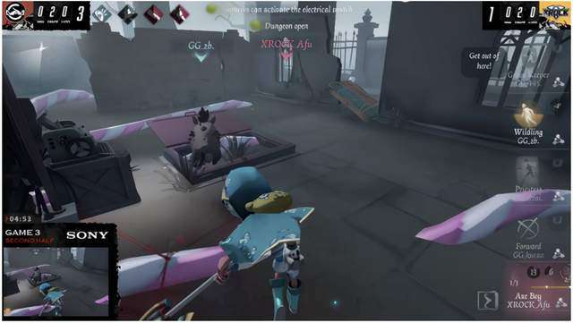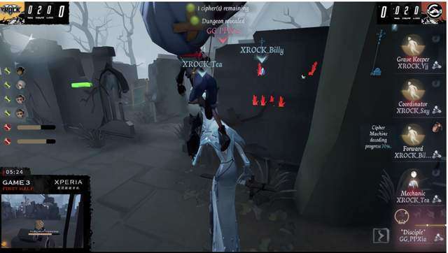 挂上机械师,场上密码机剩余2台。守墓人利用铲子无伤救下机械师,随后扛到一刀,但机械师马上被打出搏命,带离遗产机。再次挂上机械师,前锋成功抗下一刀救下机械师并且补撞让机械师拉开距离,安见状直接传送最后一台密码机将守墓人击倒在密码机旁。