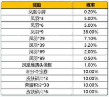 凤凰令牌兑换稀有奖励:不同数量的凤凰令牌可兑换对应的奖励,包括李白-凤求凰,王昭君-凤凰于飞,以及凤凰偕飞专属特效礼包等,详见最后兑换商店;