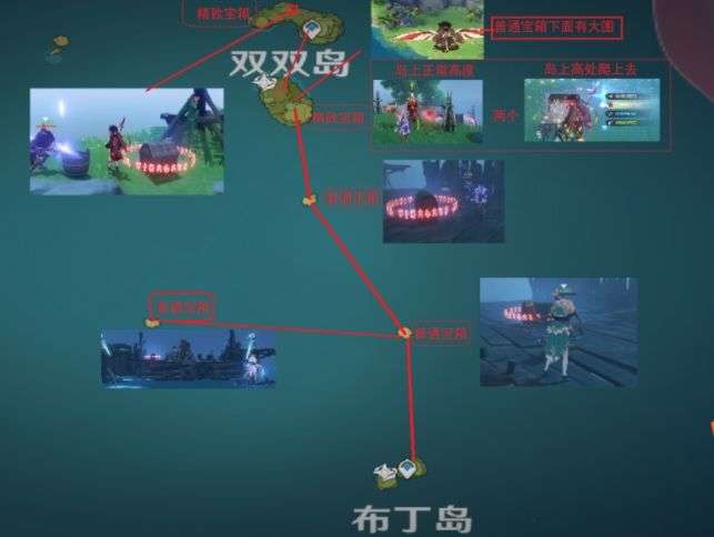 1.宝箱-普通宝箱+精致宝箱:普通好像都是5000摩拉是我太黑了吗:需要战斗解锁,别忘了顺手把地图上标记的海螺捡了【布丁岛——双双岛】八个