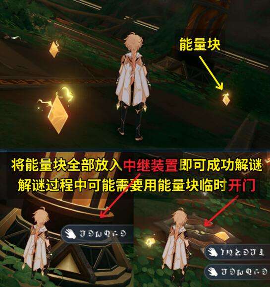 过程中可以拿宝箱。再使用2个能量块打开门再拾取1个能量块,不放回,再使用3个能量块打开门,拾取1个能量块放置到能量装置中,再到使用2个能量块打开门放置1个能量块到能量装置,再使用1个能量块打开门放置1个能量块到能量装置,最后放置不需要门的能量装置。