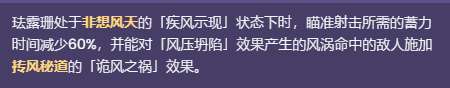 珐露珊处于非想风天的「疾风示现」状态下时,瞄准射击所需的蓄力时间减少60%,并能对「风压坍陷」效果产生的风涡命中的敌人施加抟风秘道的「诡风之祸」效果。