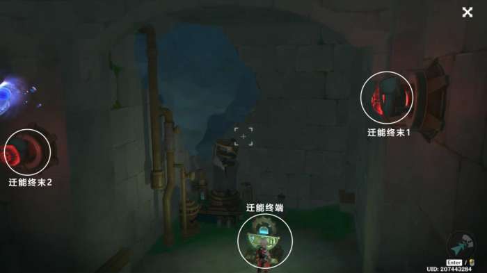 4、随后瞄准迁能终末1等待2秒,接着在瞄准并点击储能装置3和迁能终末2等待2秒;