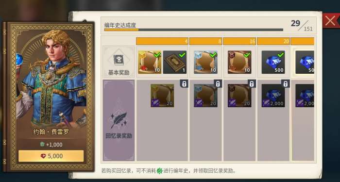 回忆录的购买方式是用红钻,购买之前,可以先看一下达成奖励的内容,确认值不值得入手再决定。界面上,会显示当前编年史的达成度、基本奖励,以及购买回忆录后,能额外拿到什么,看起来还算清楚。