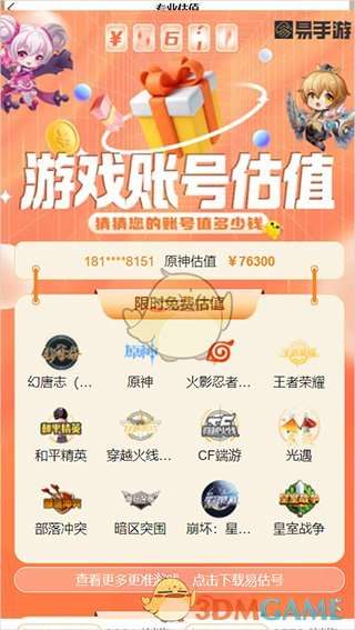 软件提交 专题合集 热门手游首先,登录易手游APP并进入“我的”页面,完成实名认证。接着,在首页点击“账号估值”选项,选择“自动估号”。然后,在限时免费估值区域挑选想要估值的游戏,并填写相关交易信息和游戏基础参数。最后,输入手机号后提交,即可快速查看账号的估值结果。
