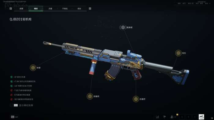 这套方案的精妙之处在于精校,如图所示,我们总共可以通过精校获得16%额外后坐力控制,以及近8%开火时武器稳定性。这些精校属性进一步提高了QJB201架枪时的稳定输出能力。