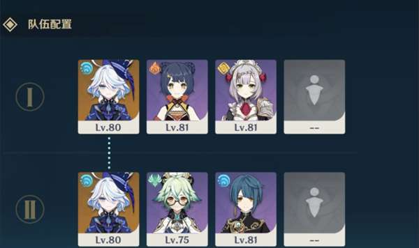 第一轮,首先如果有那维莱特的重复角色直接无脑选择那维莱特即可嘎嘎乱杀。但是像我这种没有那维莱特的只能老老实实选择试用角色芙宁娜了。第二位选择一个角色来打伤害,没错还是香菱,对付这种频繁刷新且扎堆的敌人用香菱真的爽,但前提是练度够且最好4命,毕竟少4秒大招时间伤害真的差很多。第三位角色选择一个高频提供回血的角色来触发「锐意」增益的buff,这里我选择的是女仆诺艾尔,诺艾尔开e之后普攻可以回血搭配芙宁娜e的扣血可以很快的触发buff,同时开大之后伤害不俗在香菱练度不够的情况下可以补充输出,且由于难度1下充能压力小,女仆能够实现大招的无缝衔接。第四位角色可以补个班尼特来增加队伍输出。