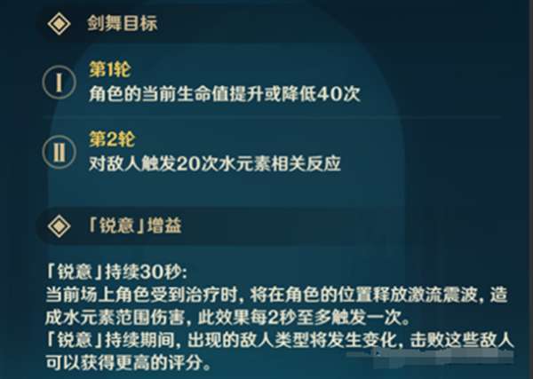 剑舞目标:第一轮,角色生命值提升或降低40次;第二轮,对敌人触发20次水元素相关反应。