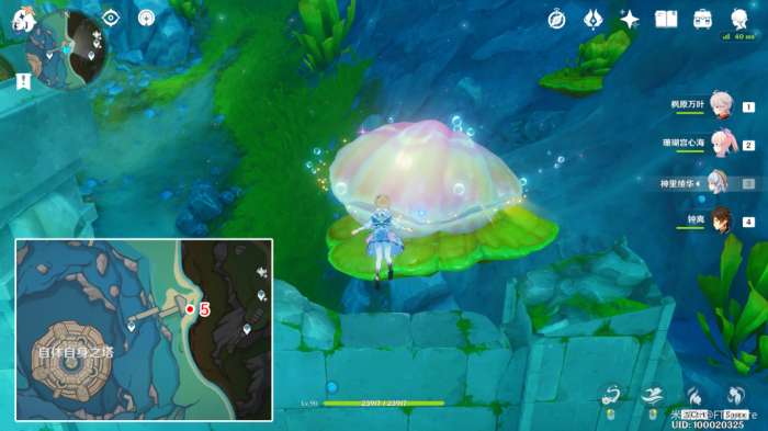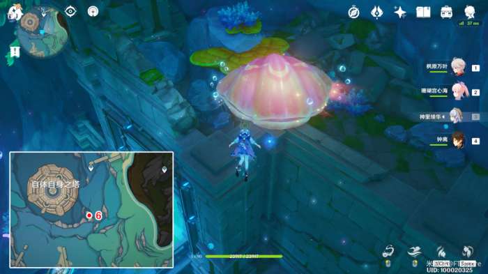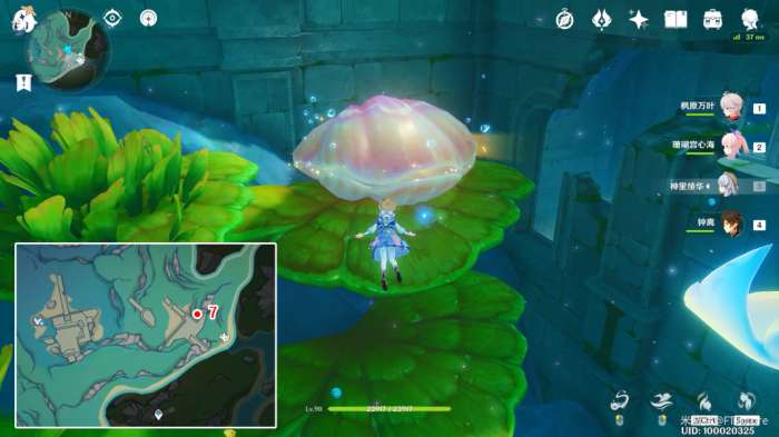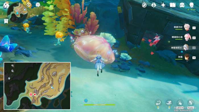 · 藏宝图:位于「万水之源·大枫丹湖」下图所示位置的贝壳中,使用普通攻击将贝壳敲开,拾取里面的瓶子,即可获得藏宝图「帕克的期冀」。