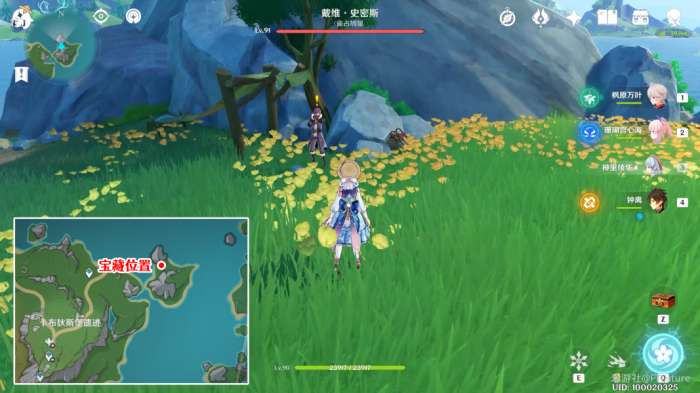 · 藏宝图:位于「万水之源·大枫丹湖」下图所示位置的贝壳中,使用普通攻击将贝壳敲开,拾取里面的瓶子,即可获得藏宝图「罗基·艾威尔森的失落」。