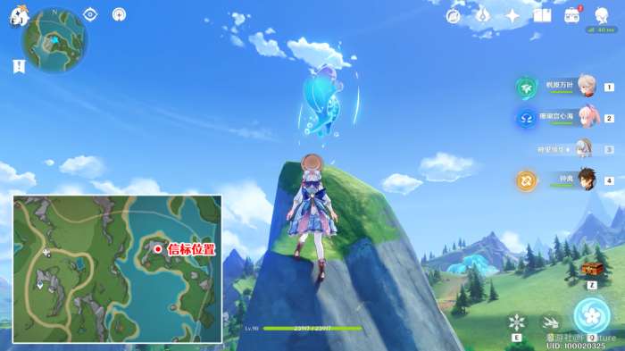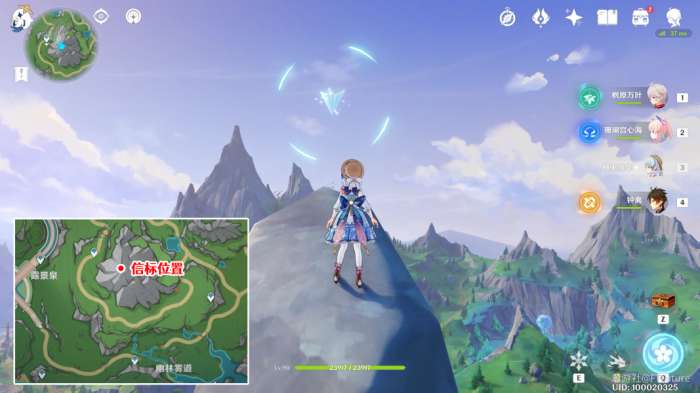 △藏宝图「帕克的期冀」· 对应宝藏:拿到藏宝图后,到下图所示位置的山顶触碰信标(白色坐标形状光点,图中被神瞳挡住了),触碰后视角会自动转向不远处地上的鱼型图案。