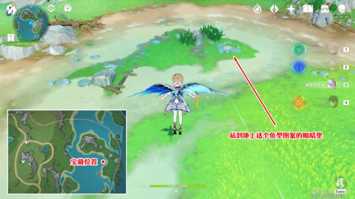 · 藏宝图:位于「万水之源·大枫丹湖」下图所示位置的贝壳中,使用普通攻击将贝壳敲开,拾取里面的瓶子,即可获得藏宝图「鲁热的信条」。