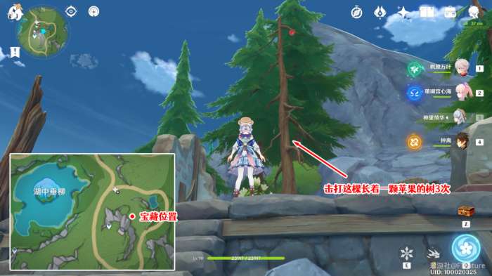 · 藏宝图:位于「万水之源·大枫丹湖」下图所示位置,接近水底的遗迹上的的贝壳中,使用普通攻击将贝壳敲开,拾取里面的瓶子,即可获得藏宝图「秋的悔意」。