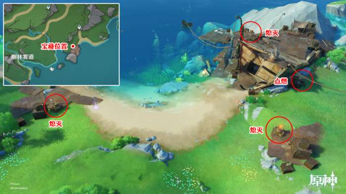 △藏宝图「弗里曼的宣言」· 对应宝藏:拿到藏宝图后,到下图所示位置,将三个放在铁皮上的火堆熄灭,把唯一一个放在草地上的火堆点燃,即可获得宝藏,一个精致的宝箱。
