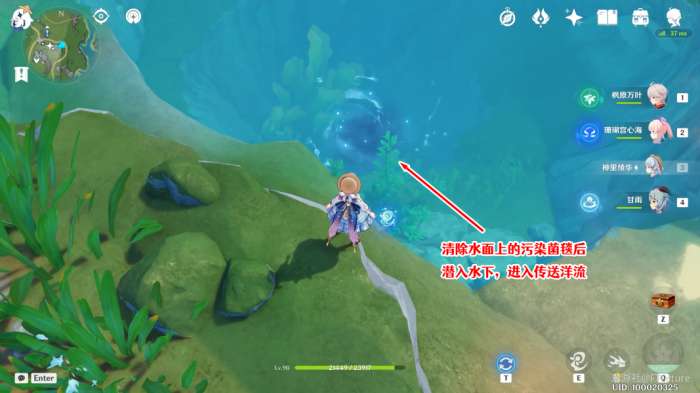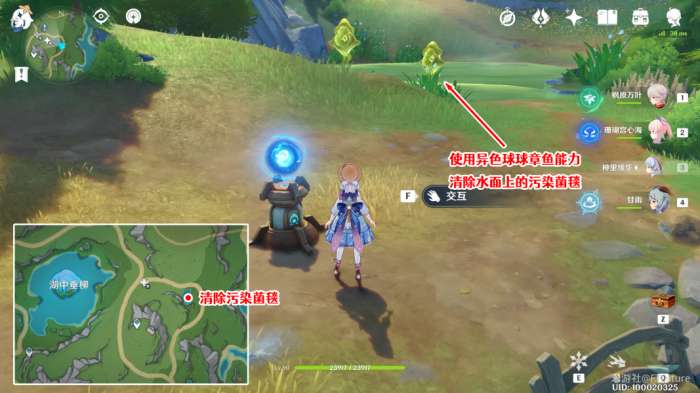 △藏宝图「秋的悔意」· 对应宝藏:拿到藏宝图后,到下图所示位置与「生态研究装置」交互,获得「异色球球章鱼」的能力,之后使用能力清除水面上的「污染菌毯」。