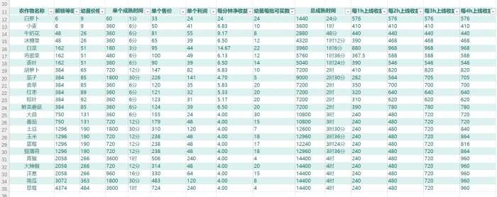 目前,农作物所需的最长生长时间为4小时。超过4小时后,收获的农作物与4小时相同。表格的Sheet2列出了所有农作物的数值(包括单价,幼苗价格,单个利润,每分钟净收益,总成熟时间),并统计了每1,2,3和4小时上线的情况下的收益情况,以供参考。