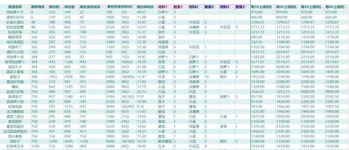 随着等级的提高,以及上线时间的限制。可以按收益更换料理。表格的Sheet1给出了目前所有菜谱的等级限制,数值和每1,2,3和4小时上线一次的料理收益。