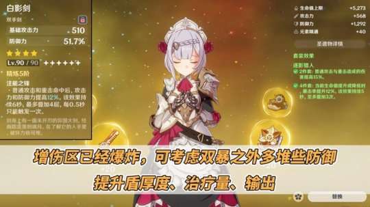 建议你选择猎人套(防御力高)、白影剑(或赤角)进行配装。因为夜兰和芙宁娜能够大幅增加伤害输出,所以诺艾尔不需要过于追求高攻击力来应对抗岩石盾。另外猎人套的高防御力可以提高治疗量和护盾盾量,加速芙宁娜增益层数的获得速度,同时避免战技盾破裂影响治疗。如果整个队伍的等级较低,需要在深渊中进行多轮循环,建议给诺艾尔装备充能沙。