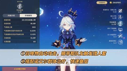 【芙宁娜】可以召唤出烧血的召唤物,协助队友触发猎人套的效果,同时与夜兰配合输出对中远距离敌人的伤害;另外,她还能提供高额的全队增伤,为4个输出体系带来不错的增益效果。