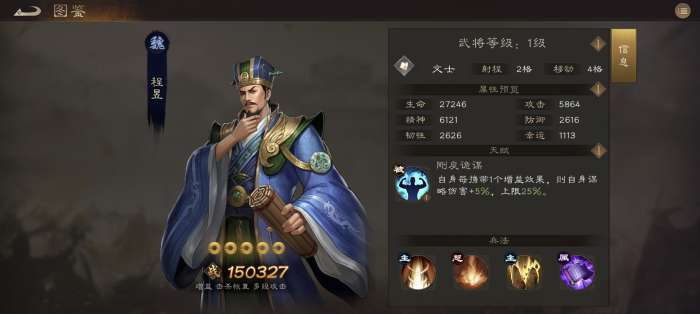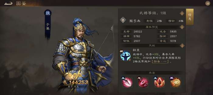 功能性武将,可冲锋3格,大招能对“移动力低于自身”的敌人施加断粮(减疗/禁疗),需搭配曹操等增移速武将。无需高练,留1个8星(6星亦可)应对特定阵容即可。