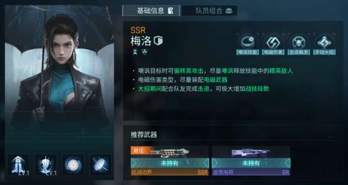 而且重盾职业当中的队员在有足够的武装之后还可以部署不同的角色,利用这样的掩体装置可以以自身为跳板,然后将队员输送到各个位置上面,所以在整体有了一定稳固防线之后,大家应对高强度的火力以及持久战上面,整体的能力都会有足够的提升,在启动这类效果的时候,大家可以选择的重盾职业就是梅洛,梅洛在游戏当中就是属于一个重盾职业里面的代表角色,她目前达到的品质也是SSR的品质,在效果上面有一个嘲讽的能力,这个嘲讽能力可以在攻施加给目标的时候,可以吸引这个敌人的攻击效果,而且还可以利用嘲讽技能针对当中的一些精英敌人,所以如果针对的敌人是精英对手的话,那么这里根据她的能力就可以带来承伤的效果。