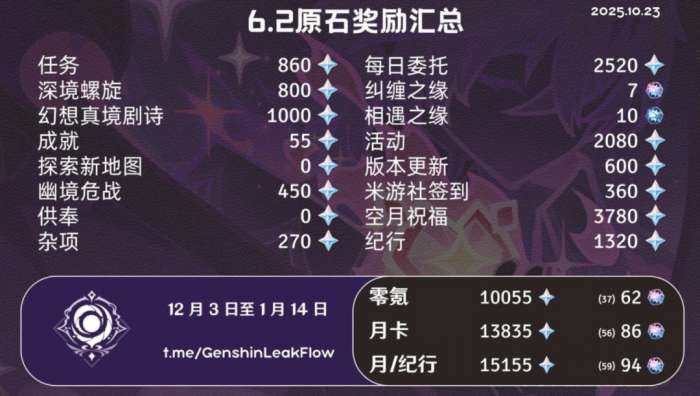 6.2版本期间,平民玩家最高也只能获得62抽,也就是10055原石,大月卡玩家相对较多,可以获得94抽,换算是15155原石,整体来看并不算多。
