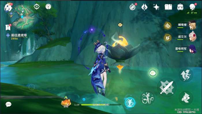 3、同时点亮莲花灯的时候容易忽视掉瀑布顶端处的莲花灯,我们需要借助浮石达到瀑布顶端点亮莲花灯。莲花灯被点亮后即使移开【流莲盏】也会持续发亮一段时间。这里建议大家先点亮瀑布顶端的莲花灯,在下来点水池里的,因为莲花灯持续的时间是不够浮石将我们送上去的。