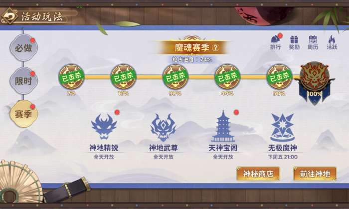 神地装备是赛季中的核心养成内容之一,拥有多种养成方式。通过不断培养与强化装备,提升装备评分,少侠便能挑战更高难度的赛季玩法,获得更强力的装备回馈,实力也会一步步提升。