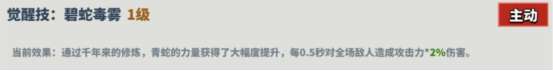 特点:通过青蛇的攻击力不断提升伤害输出,随着青蛇的成长,技能的威胁会逐步增强,成为非常强力的群体消耗技能。