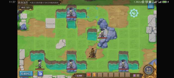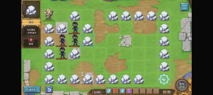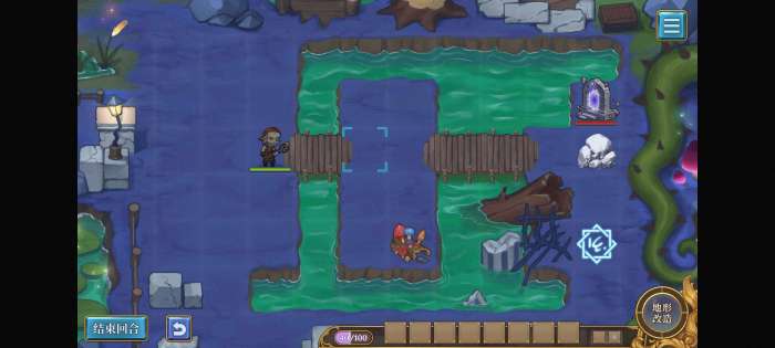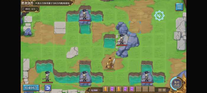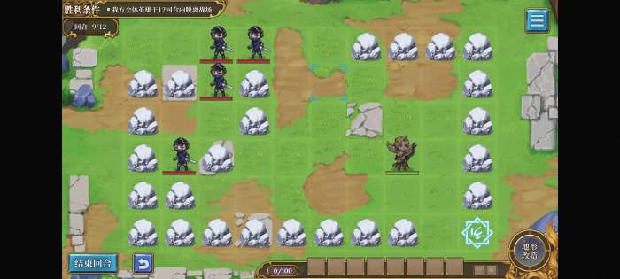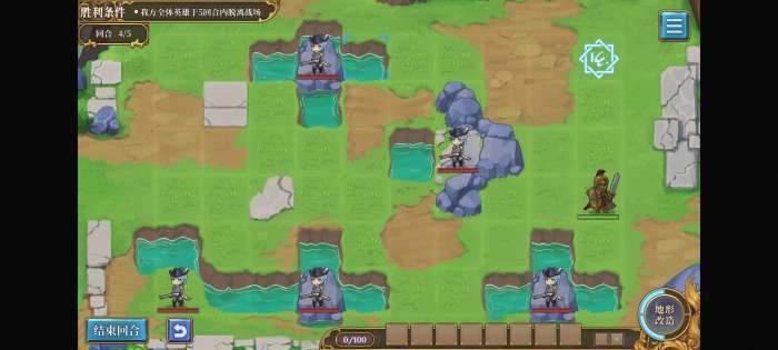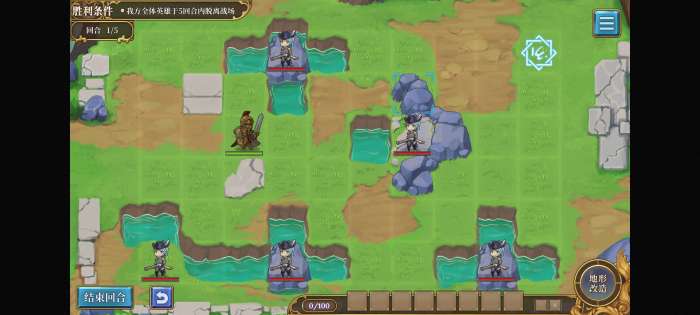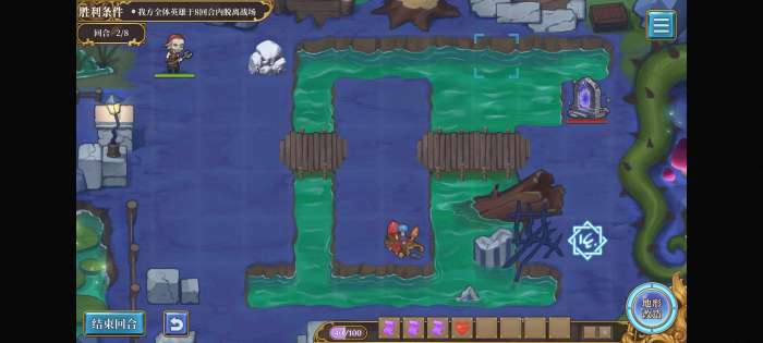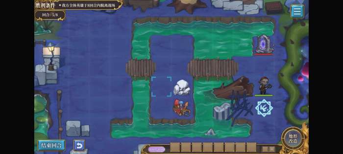第一回合不要动,第二回合用石头把召唤阵下面一格的堵住,就不会出怪了。等英雄走到桥那里再挪开直接溜。