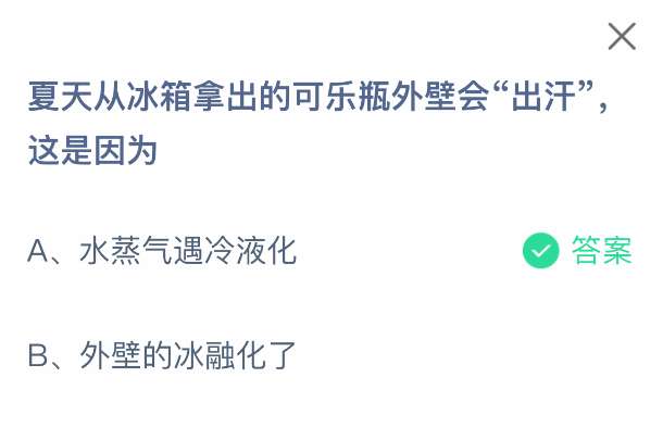 以上就是夏天从冰箱拿出的可乐瓶外壁会“出汗”,这是因为,支付宝蚂蚁庄园2025年8月2日答案最新,更多精彩内容,请点击关注pk游戏网更新!