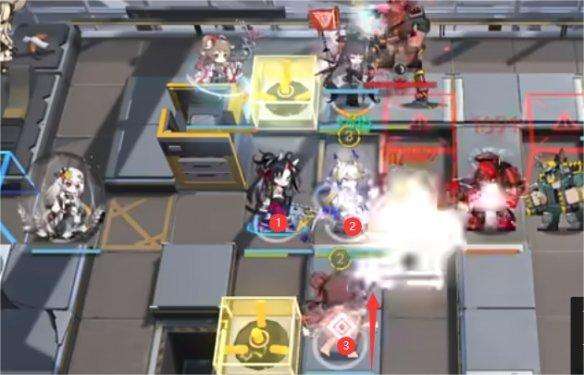 ② 诡雷左侧的源石爆炸物爆炸后,部署塞雷娅 → 艾雅法拉(向上)
