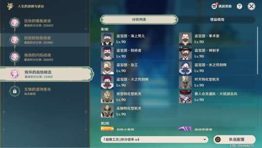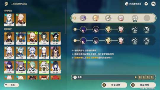 在每个挑战中,活动将会提供2名试用角色。如果队伍中配置的自己的角色越多,角色等级也越高,就能获得更多的「载荷」,用于兑换并装配更高等级的「增益模组」。举个例子,如果三个队伍中有两个相同的90级角色,那么载荷就可以充分利用来获得增益。因此,可以考虑让三个队伍使用相同的角色阵容。