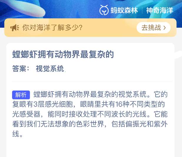 软件提交 专题合集 热门手游螳螂虾拥有动物界最复杂的?【神奇海洋】12月2日新题目已开答!正确答案现已公布,点击领取拼图,一起为修复海洋生态贡献力量!今日正确答案是:【视觉系统】。螳螂虾拥有动物界最复杂的视觉系统。