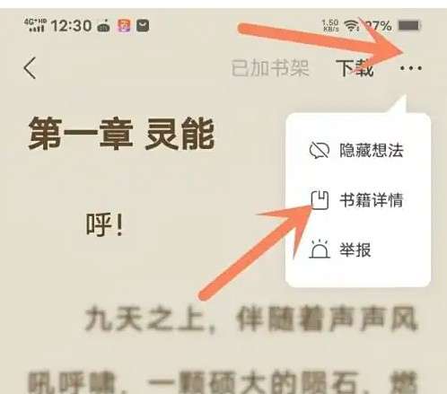 打开桌面上的速读免费小说APP进入书籍阅读页面,点击书籍详情。