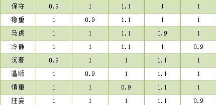 第4个主加魔攻的性格则为保守、稳重,冷静和马虎。同样都是增加10%的攻击,所损失的属性分别就有10%的物理攻击,物理防御,速度和魔法抗性;第5个加的就是魔抗的性格。可选择的性格培养有沉着、狂妄,慎重和温顺,增加的魔抗属性有10%,同样,减少的分别为10%的物理攻击、速度、魔法攻击和物理防御;最后一个就是比较平衡的性格,这种基本上既没有加成,同样它也没有削减,它的各方面基础属性都是默认的增长比例,例如认真平衡等这一类,也都是属于平衡性格。不会有任何属性增减。