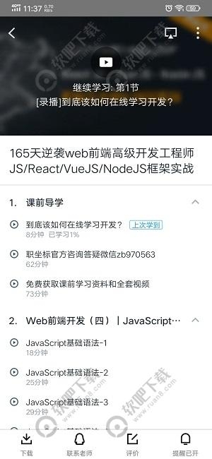 3、进入该课程的界面之后可以看到在课程下方有一个【评价】的选项,点击一下即可对该课程进行评论,需要用户注意的是想要进行评论需要上课时间达到20分钟才可以进行评论。