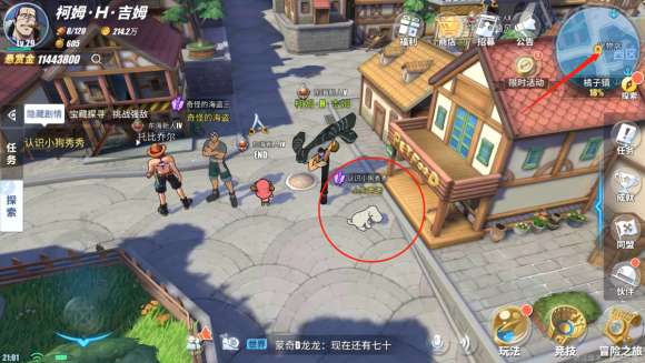2、根据镇长的指示,去找小狗,小狗在镇长的左边,宠物店门口,给它食物和它玩,一会你们就是好朋友了。快速完成【认识小狗秀秀】探索任务