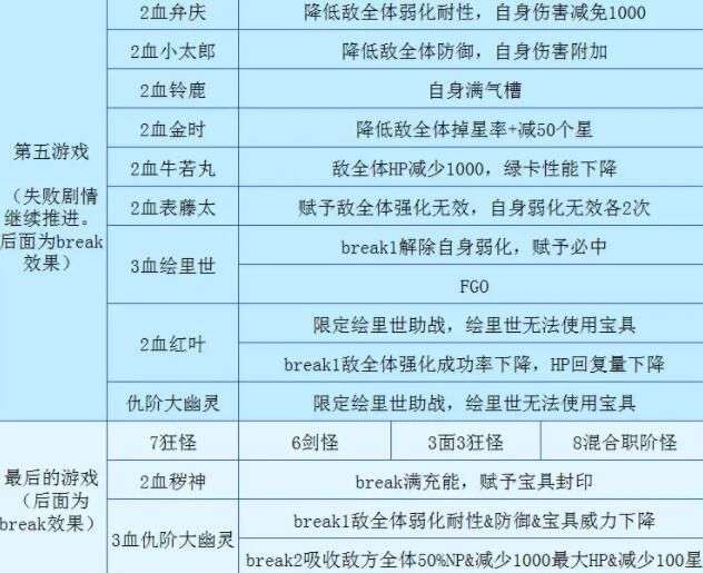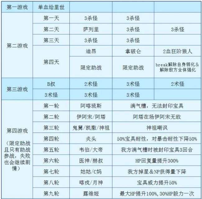 主线关卡:以上为主线关卡的配置,第1~3游戏都比较简单,从第4游戏开始就有点难度了,副本是按积分制来开启的,副本只能用系统给的助战,无论打输或打赢都会继续剧情,但是你不能一直输,至少需要赢几把,第一次输了之后后面还可以再挑战,敌人血量会降低一些,所以在比较简单的副本中尽可能获胜吧,根据敌方的配置,大家在进本之前选择好对应的魔术礼装,会有更大帮助。