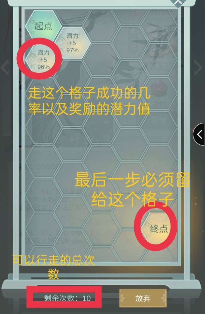 而每个格子里的潜力,在突破过程中是没作用的,它是你突破成功之后奖励给你的潜力值,而因为奖励潜力越多的格子行走成功率越低,所以移动的时候必须有取舍。