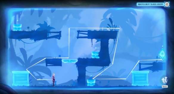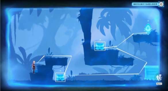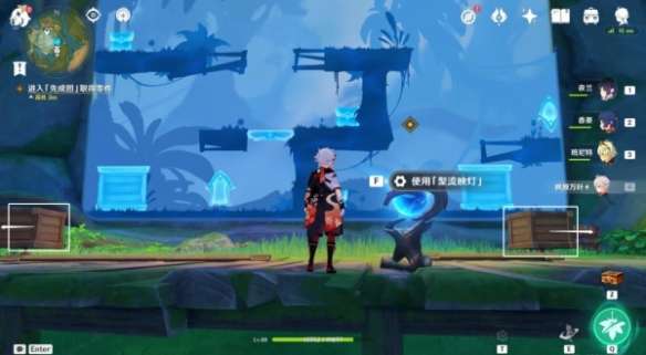 将图中木箱往右推到图中位置后,使用“聚流映灯”,接下来按图中指引路线,开启2个宝箱,在离开“先成图”世界(界面右上角可随时离开)。