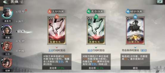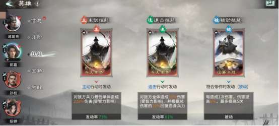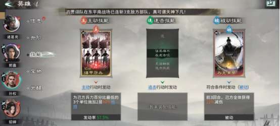 但是选择了这三种人物角色之后,还需要合理排兵布阵,正确放置在合适的位置上,才能将抗击打能力以及抗伤害能力发挥到极致,就比如诸葛亮需要放在最前排,另外两位人物角色就要站在诸葛亮的身后,能够将孙权的天赋技能发挥出来,在不同的战场模式当中,都可给自己的队友造成四维的属性加成。其次,就算自己的队友遭受到敌人的攻击时,也会有很大的几率可以快速恢复兵力。其实此阵营当中不得不承认郭嘉的天赋也是非常出色的,善于和敌方阵营斗智斗勇,来一场智力比拼。