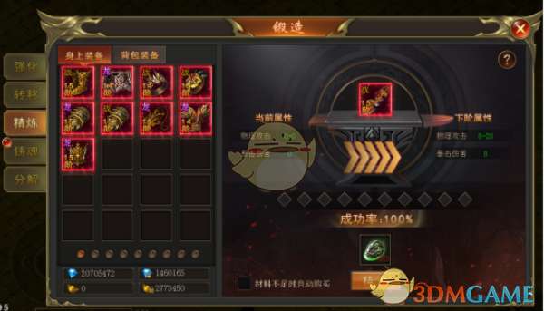 2、精炼:通过几率性的精炼从而提高人物的攻击和防御力。