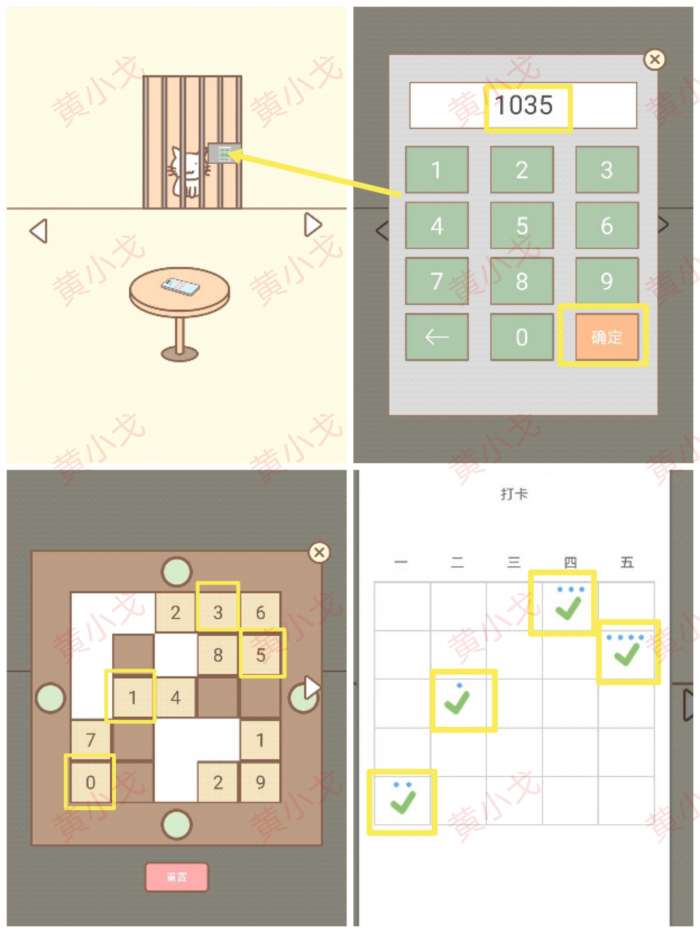 3.(中)点击门上的密码锁,根据机关上的线索结合日历上的线索,输入密码:1035;打开门