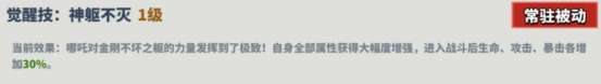 描述:哪吒对金刚不坏之躯的力量发挥到了极致!自身全部属性获得大幅度增强,进入战斗后生命、攻击、暴击各增加30%。