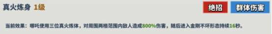 描述:哪吒使用三位真火炼体,对周围两格范围内敌人造成800%伤害,随后进入金刚不坏形态持续16秒。