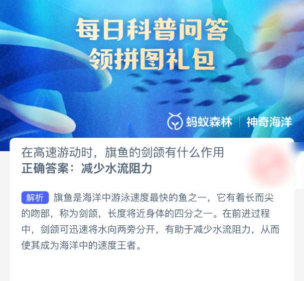 软件提交 专题合集 热门手游在高速游动时,旗鱼的剑颌有什么作用?【神奇海洋】10月31日新题目已开答!正确答案现已公布,点击领取拼图,一起为修复海洋生态贡献力量!今日正确答案是:【减少水流阻力】。旗鱼在前进过程中,剑颌可迅速将水向两旁分开,有助于减少水流阻力,从而使其成为海洋中的速度王者。