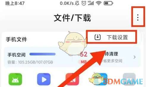3、然后点击页面右上角的小三点拓展按键,再点击下载设置。