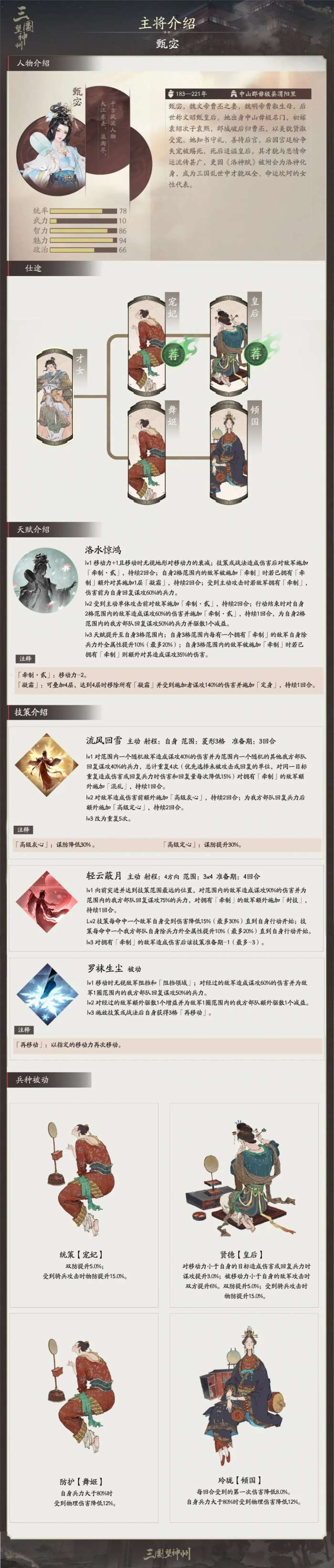 甄宓的天赋【洛水惊鸿】能无视地形对移动力衰减,同时对敌军稳定施加牵制、凝霜、定身等减益,完美诠释其蕙质兰心、巧驭战局的绝代风华。